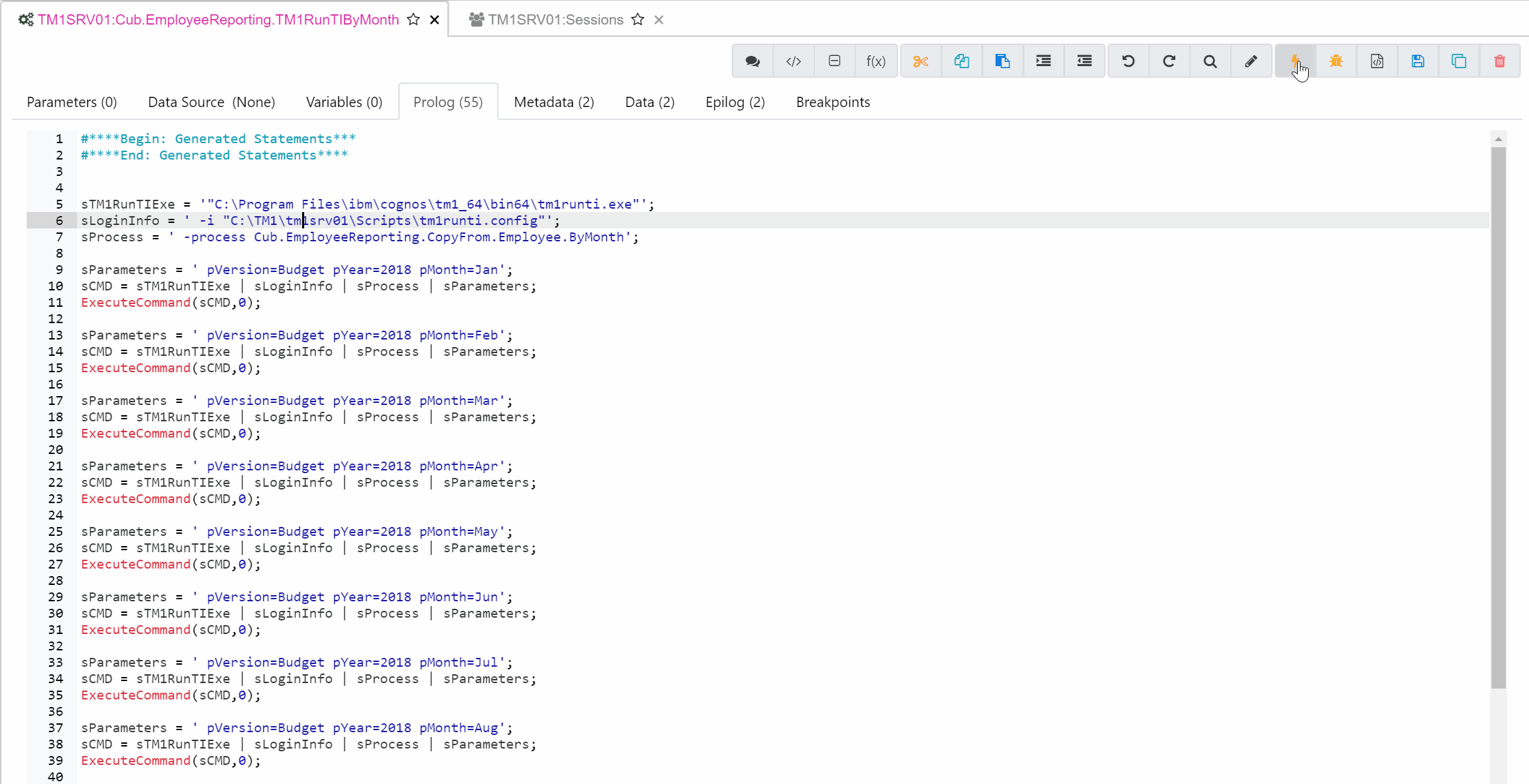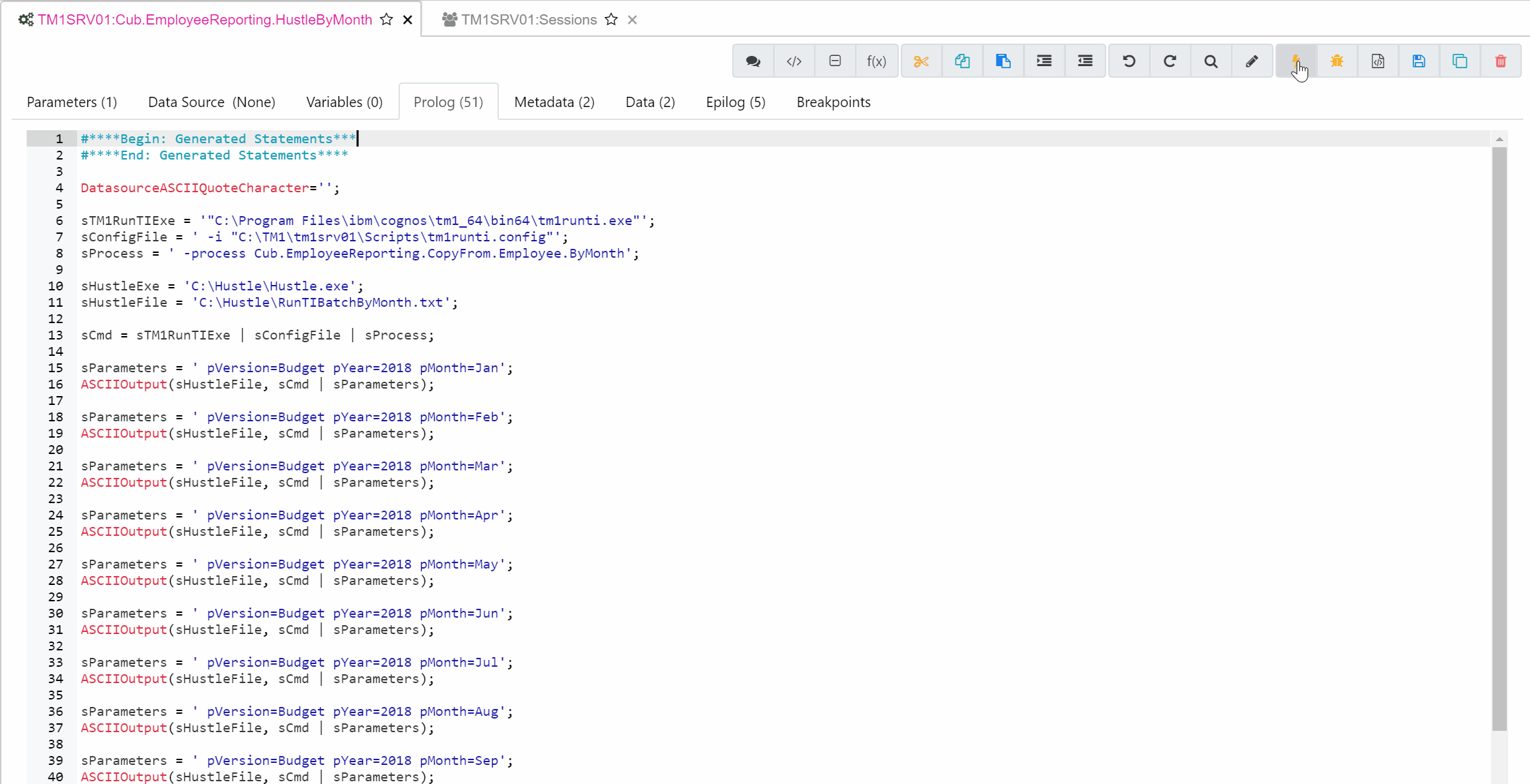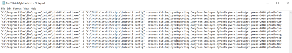sTM1RunTIExe = '"C:Program Filesibmcognostm1_64bin64tm1runti.exe"'; sConfigFile = ' -i "C:TM1tm1srv01Scriptstm1runti.config"'; sProcess = ' -process Cub.EmployeeReporting.CopyFrom.Employee.ByMonth'; sCmd = sTM1RunTIExe | sConfigFile | sProcess; sParameters = ' pVersion=Budget pYear=2018 pMonth=Jan'; ASCIIOutput(sHustleFile, sCmd | sParameters);