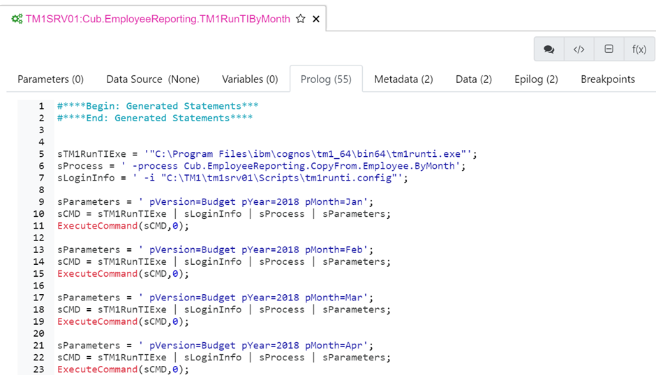 sTM1RunTIExe = '"C:Program Filesibmcognostm1_64bin64tm1runti.exe"'; sLoginInfo = ' -i "C:TM1tm1srv01Scriptstm1runti.config"'; sProcess = ' -process Cub.EmployeeReporting.CopyFrom.Employee.ByMonth'; sParameters = ' pVersion=Budget pYear=2018 pMonth=Jan'; sCMD = sTM1RunTIExe | sLoginInfo | sProcess | sParameters; ExecuteCommand(sCMD,0);