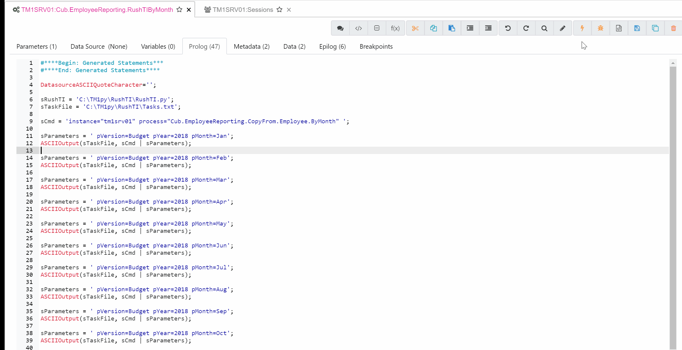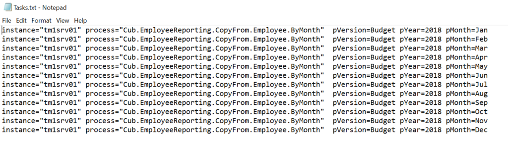 sTaskFile = 'C:TM1pyRushTITasks.txt'; sCmd = 'instance="tm1srv01" process="Cub.EmployeeReporting.CopyFrom.Employee.ByMonth" '; sParameters = ' pVersion=Budget pYear=2018 pMonth=Jan'; ASCIIOutput(sTaskFile, sCmd | sParameters);