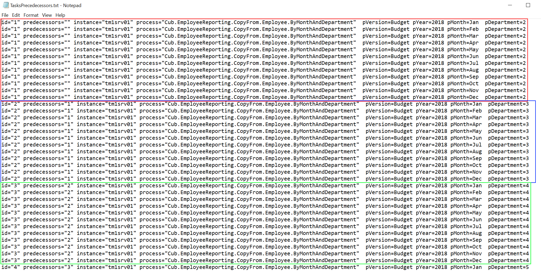 In the example below we are splitting the processes by department and months. We set as predecessor each department making sure that all data for one department has been copied before running the next department.