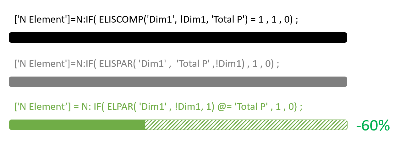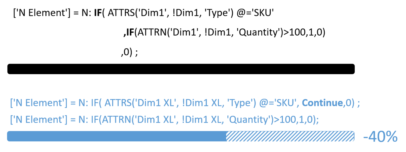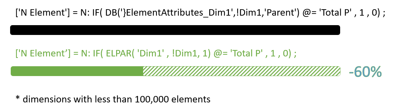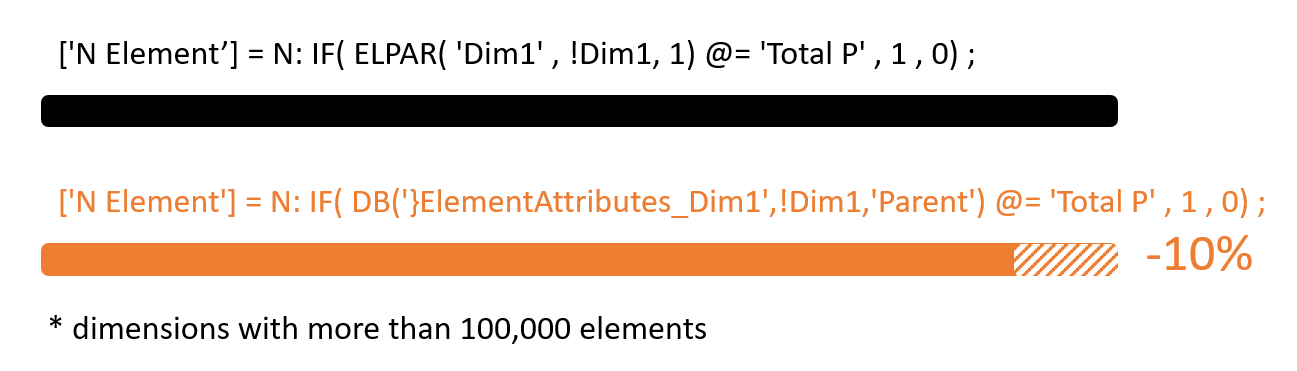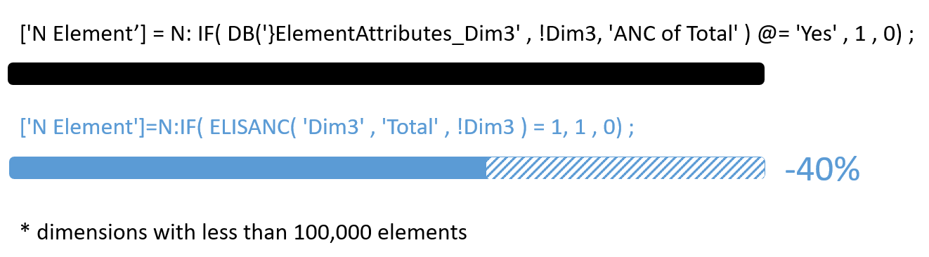 Using the ATTRS(dimension, element, attribute) or ATTRN(dimension, element, attribute) function looks like the more logic way to get an attribute value, but actually it is much slower than getting the value directly from the }ElementAttributes_ cube using the DB function, DB(‘}ElementAttributes_Dimension’, !Dimension, attribute). On average in our environment, we have found out that the DB function is 70% faster:
