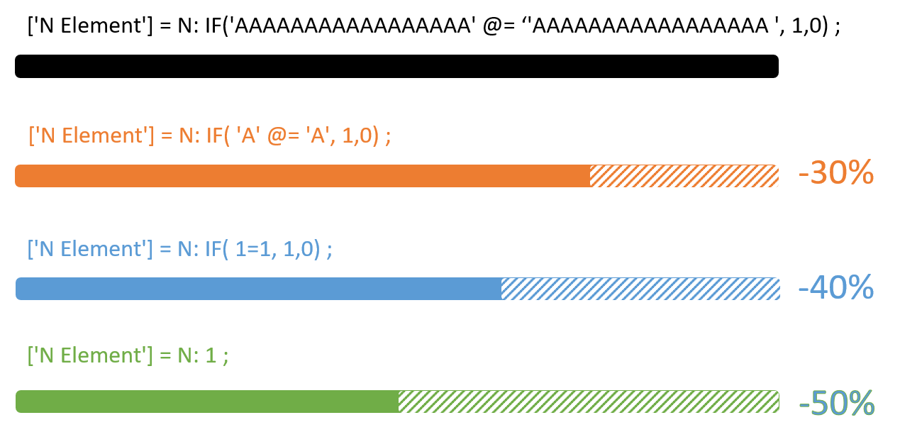 We’ve found out that the ATTRS function is faster than ATTRN even though the first one requires a string comparison. The SUBST function which returns a sub-string of the element is 75% faster than ATTRN!