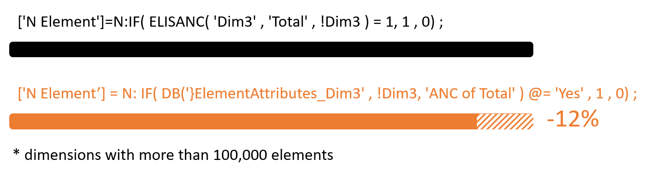 To find out if element2 is an ancestor of element1, you could either use the ELISANC(dimension, element1, element2) function or an attribute value with the DB function as above. In our cube, the ELISANC function is 40% faster on small dimensions: