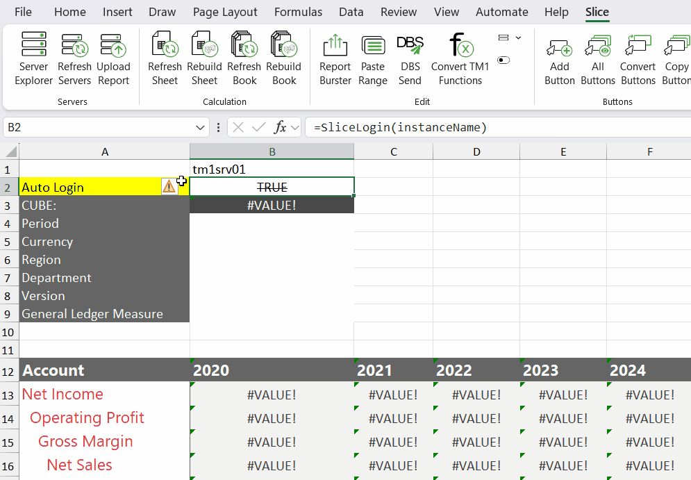 A new function has been added to allow SSO auto-login in Slice. This new function is called SliceLogin. When a user will open a report including this function and click the refresh button, Slice will automatically log in the user into the TM1 instance.