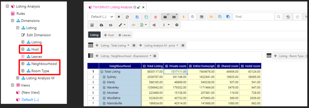 From this file, we are going to build one cube with two dimensions and multiple hierarchies to analyse the neighbourhood per room type as below: