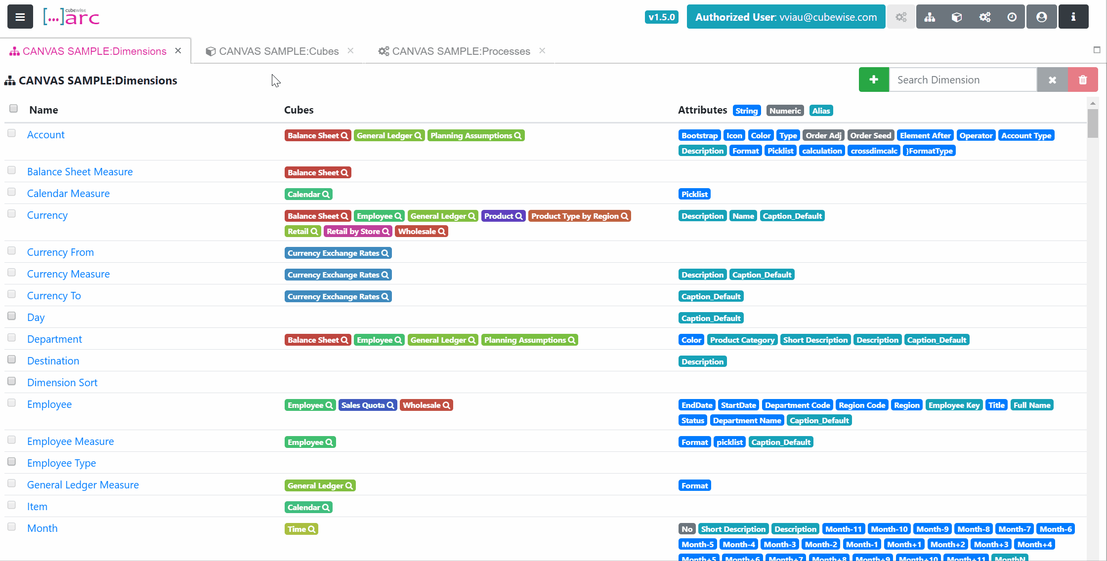 Arc includes summary views that organize your model’s dimensions, cubes, processes and chores.