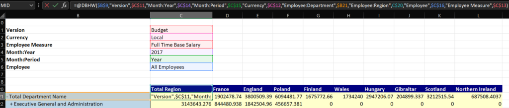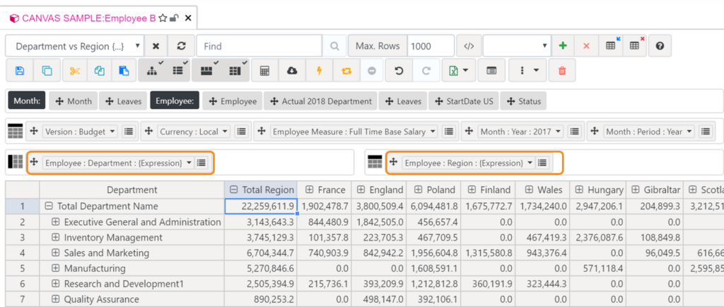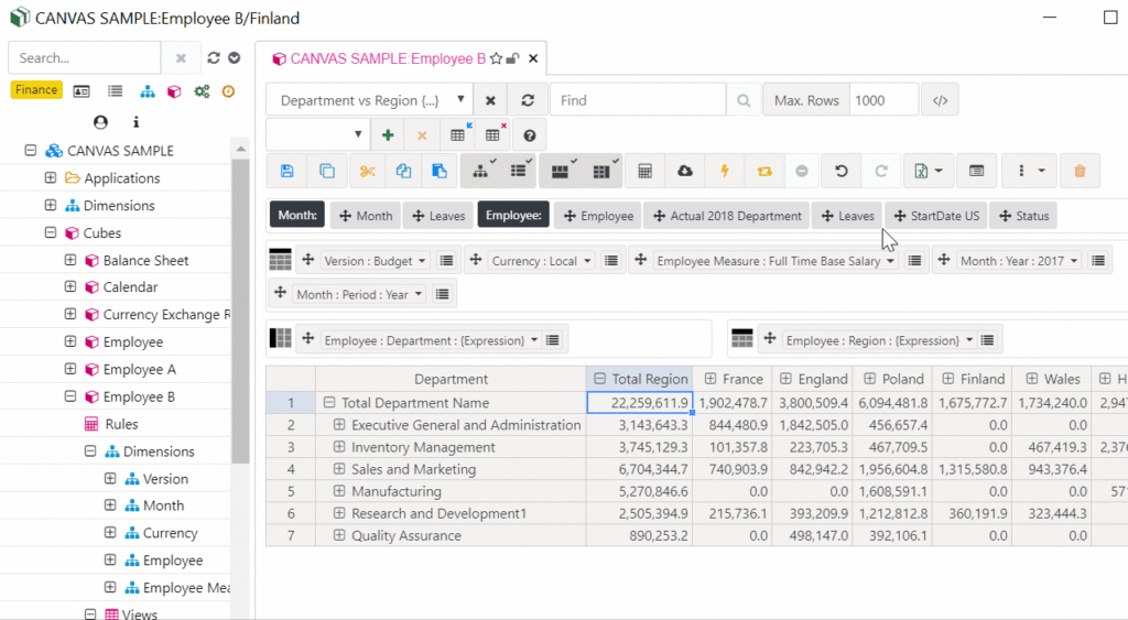You can then place hierarchies from the same dimension into rows and columns for analysis. In the example below we have the ‘Department’ hierarchy of the ‘Employee’ dimension displayed in rows and the ‘Region’ hierarchy displayed in columns.