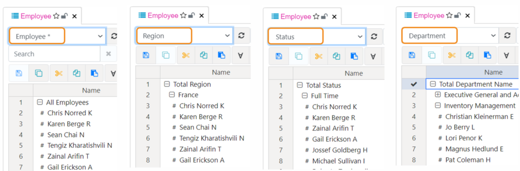 If we look at the ‘Employee’ dimension, we can look at employees by region, status, or department without having to create a new dimension.