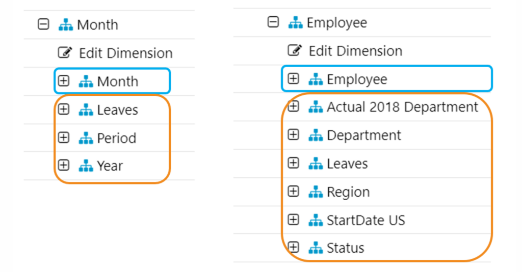 The ‘Month’ dimension has 4 hierarchies, and the ‘Employee’ dimension has 7.