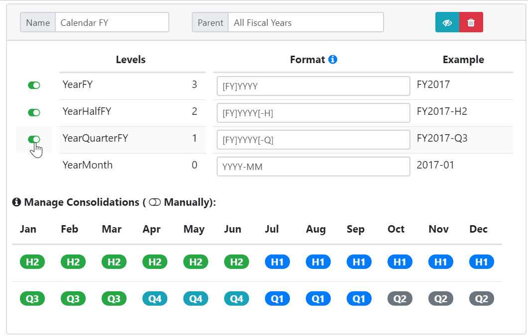 Some hierarchies such as the Calendar FY (Fiscal Year) has some extra options. You can define when the year should start.
