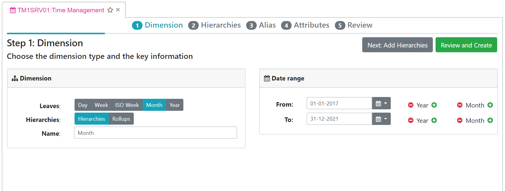 Choose the dimension type and you can just click the Review and Create button to create the new dimension with all default options: