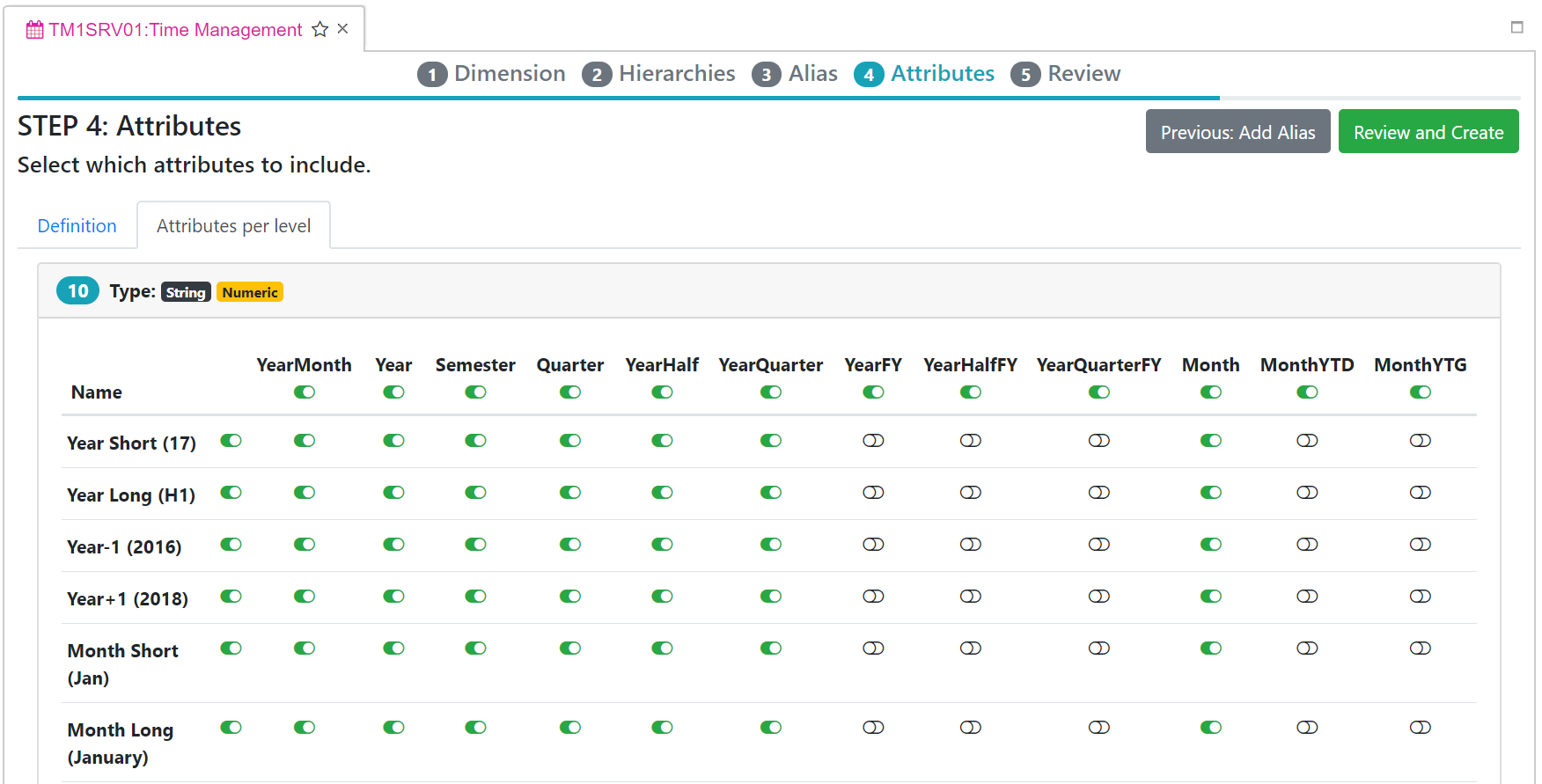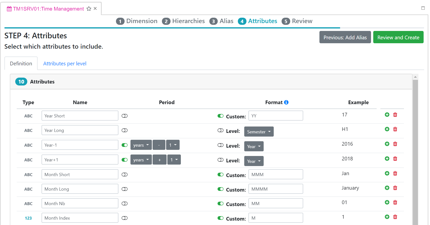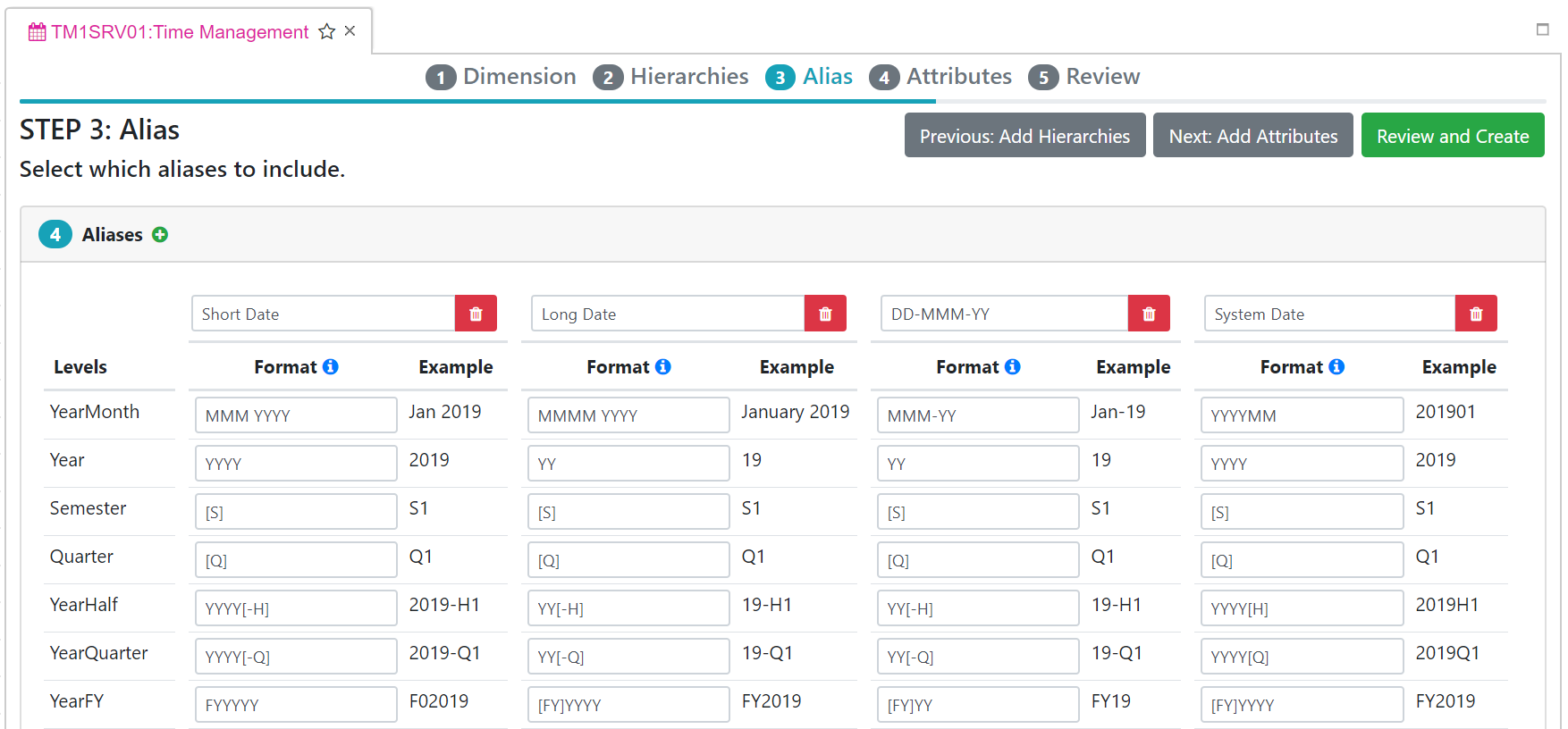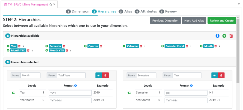 In step 3, you can define aliases for all levels available in the hierarchies, you can click the “+” button to add a new alias or the trash icons to remove one: