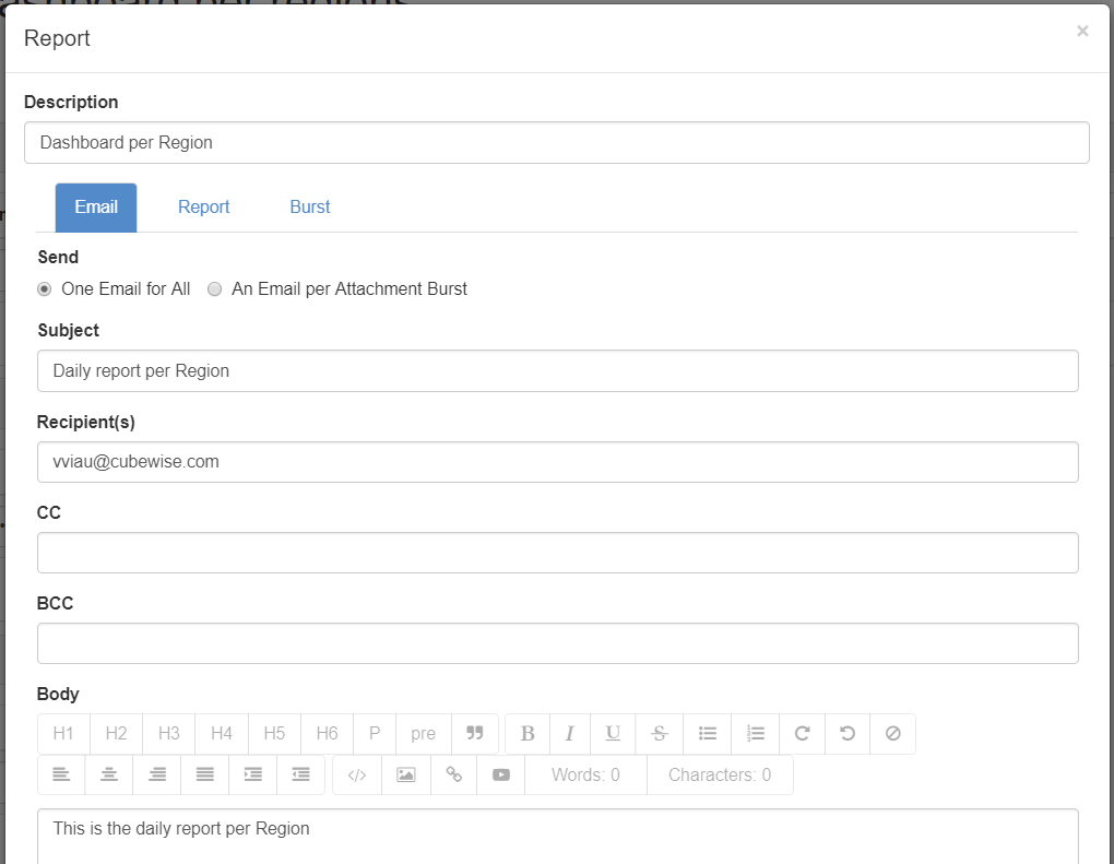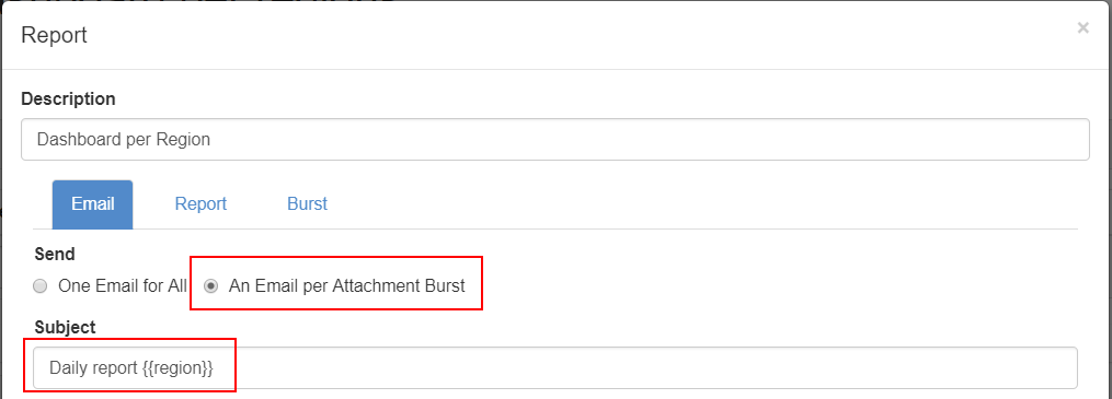 For each report you need to specify the email information. The description is used only in the Task Scheduler. If you burst multiple reports, you can choose between sending one Email for all reports or one email per attachment: