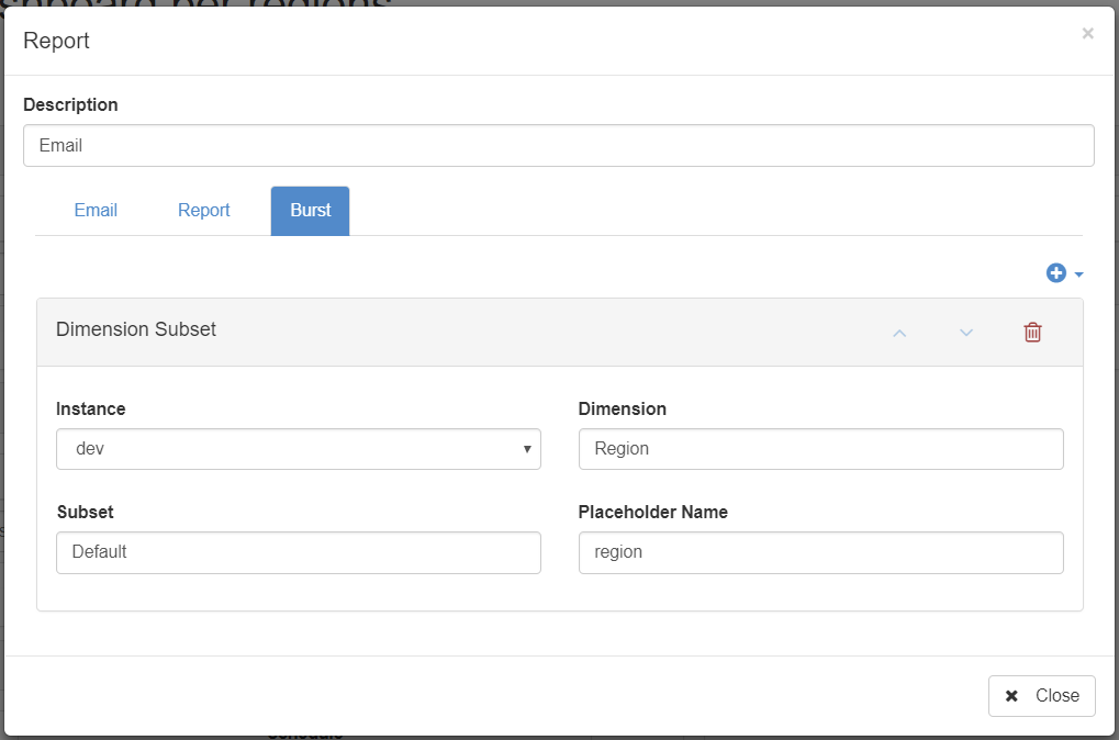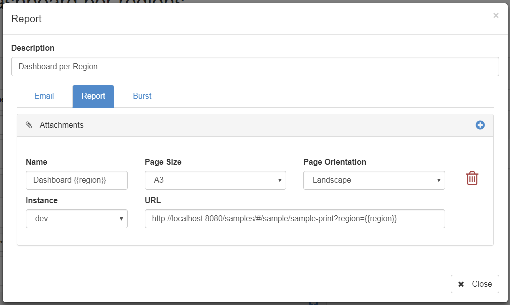 In this example, the bursting will be based on the regions. In the attachment name and in the url we use {{region}} to get the value of the region we are bursting: