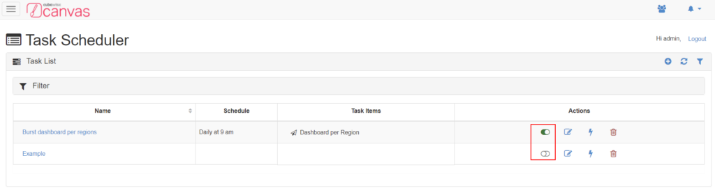 From Canvas 2.0 and up, there is now a Task Scheduler which you can use to schedule tasks. These tasks can contain TM1 processes, TM1 chores or Canvas pages. This article describes the steps to follow to set up a new task which is going to send by email one dashboard per region.