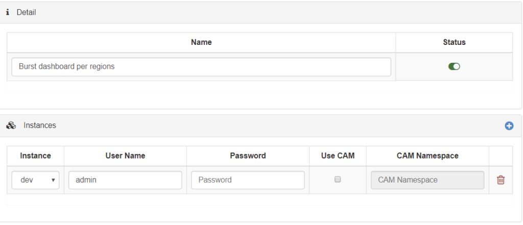 The name is the task name which will appear in the main page. There is a status button which is active by default. You then need to add the login information of the TM1 instance that will be used on this task: