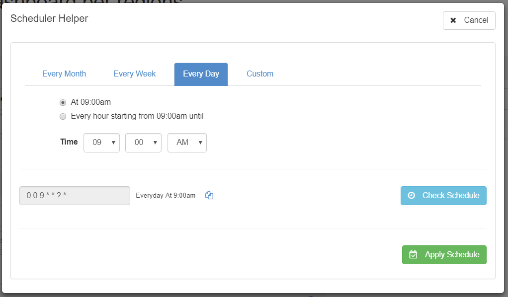 A pop-up window will appear with different options to choose from for scheduling your task such as every month, week, day, etc.: