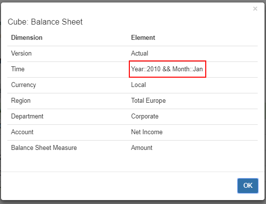 For example, to get the value from 2010 Jan from the Time dimension, you will need to use the following: