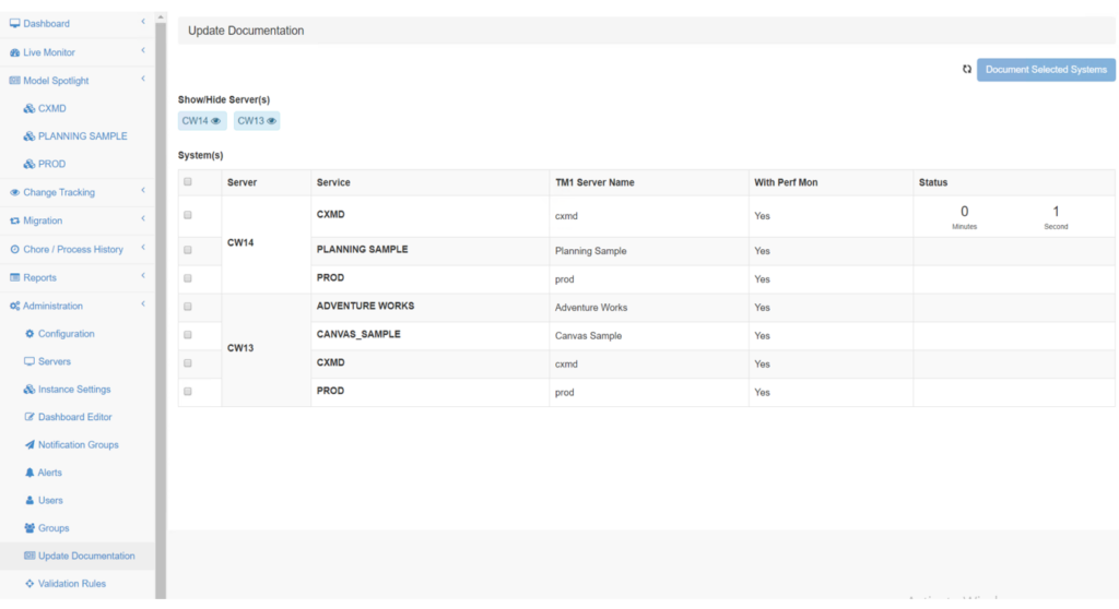 To run the documentation, go to Administration > Update documentation, then tick the instances and click the Document Selected System: