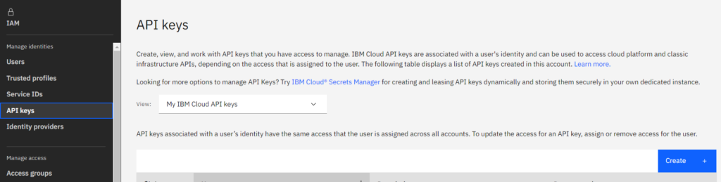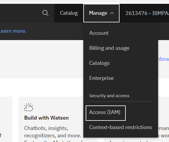 To generate your api key, connect to cloud.ibm.com with your account. Then go to Manage and click on Access (IAM):