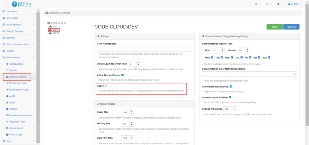 The documentation is Pulse’s backbone. Many features such as Change tracking rely on the documentation, when a new instance is set to Active, go to Administration > Update Documentation, pick a TM1 instance and click Document Selected Systems: