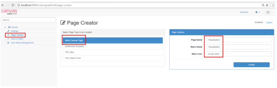 To create a new page, it is recommended to use the Page Creator which you can find in the Admin section. Each Canvas application has its own Admin section. In the following example, our application name is training. You can access the Admin section of the training application via the following URL: