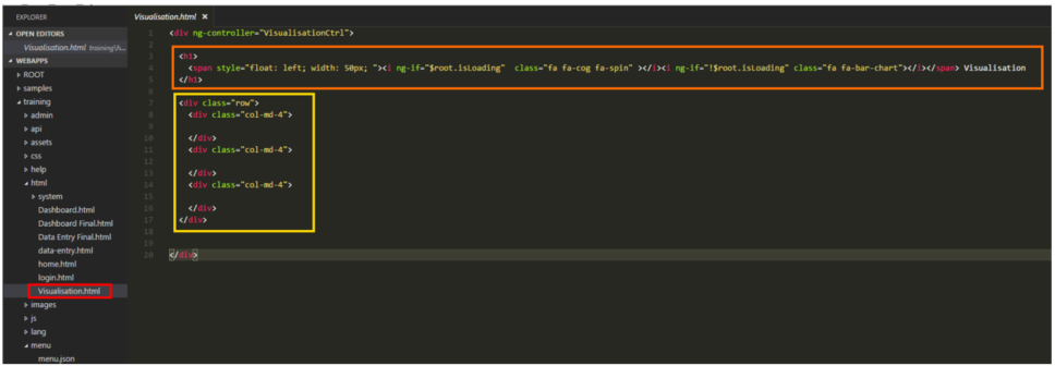 When you use the Page Creator to create a new page, Canvas creates a new HTML file with the same name in the <application name>html folder. Canvas generates a basic HTML code, the header with the title and icons you chose (in orange) and an empty row with 3 blocs (in yellow), just to pre-define the structure of the page.