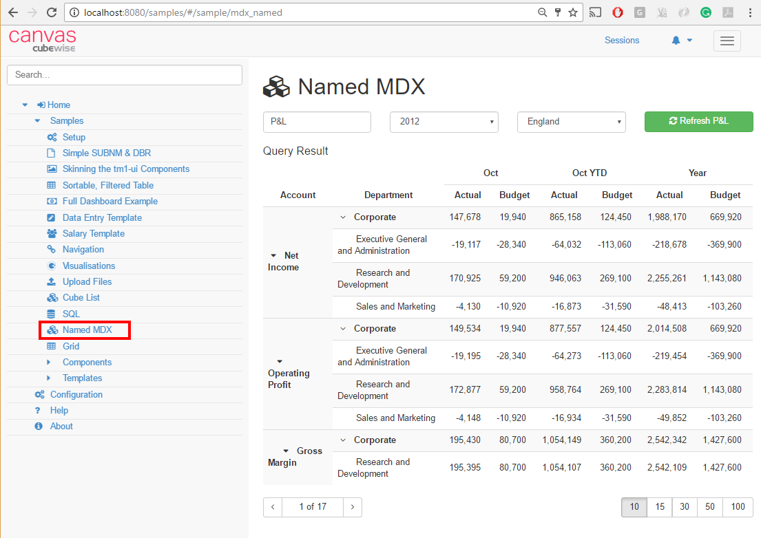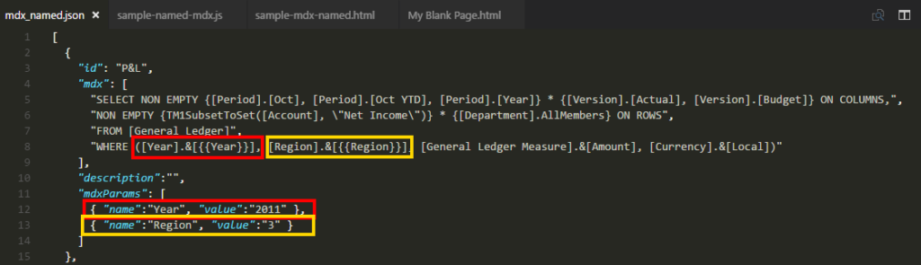 Currently the structure of our MDX statement is static, one way to show data from a different year is to go to the mdx_named.json file and update the MDX statement. The P&L MDX statement has 2 parameters Year and Region. Let’s replace 2012 with 2011: