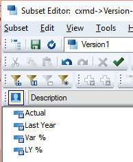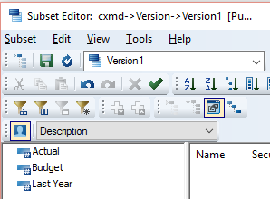 We need two element sets “page.depts” and “page.versions”, one will be used to drive the row set based on a Department subset called “Corporate1” and the second one will drive the columns based on a Version subset called “Version1”: