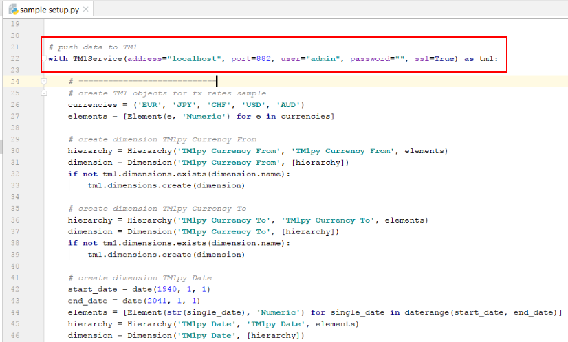 Before running the script you open the sample setup.py script and update the TM1 instance connection settings: