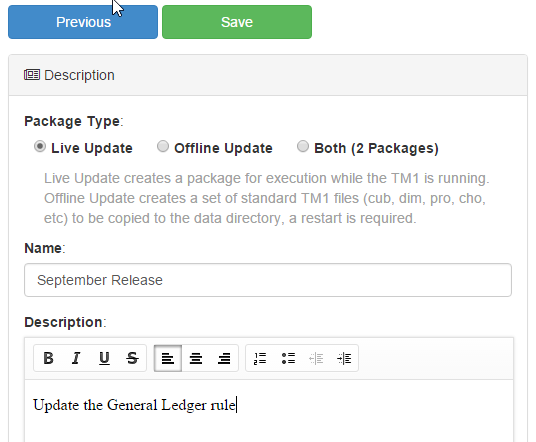 - Live Update (Hot Promote): Creates a package that can be executed on a running TM1 instance. These packages do not migrate cube data, views or subsets but provide less down time as a restart is not required.
