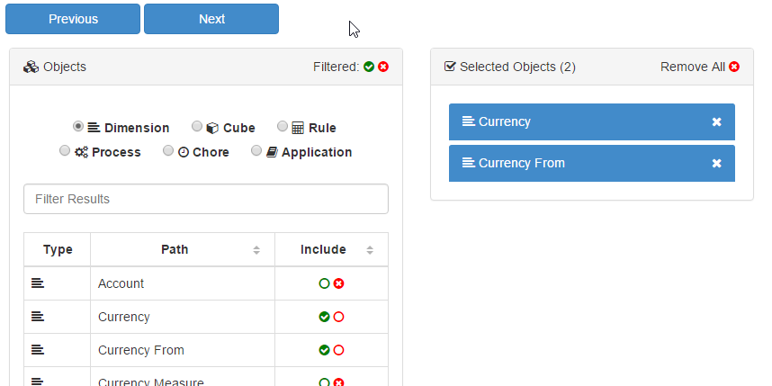 - Now you can select which objects you want to include in your package. Toggle between the different objects type using the radio buttons and then select the items using the checkbox in theIncluded column. Alternatively you can select objects in bulk by using the Filter and Add Filtered andRemove Filtered buttons.
