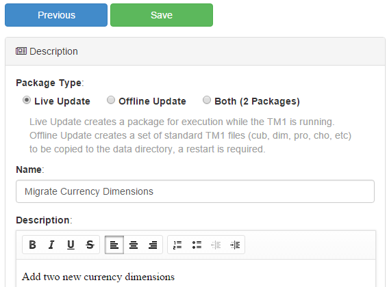 - Live Update (Hot Promote): Creates a package that can be executed on a running TM1 instance. These packages do not migrate cube data, views or subsets but provide less down time as a restart is not required.