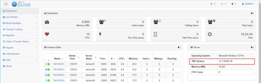 A quicker way to check the TM1 version number is to open the Pulse dashboard, in the server section you will find the TM1 server version which matches the version number in the cmplst.txt: