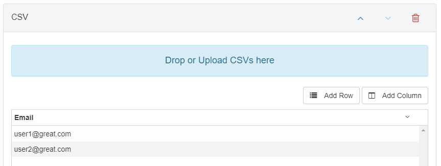 Using comma separated values as a starting point can also be used. This method allows you to use adhoc data. You can start by uploading a CSV into the provided box or create your own table of information: