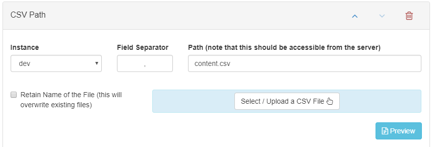 Instead of starting with a CSV file, you can provide a CSV path accessible in the server which will then get parsed when the task runs. This allows you to update the file prior to running the actual task, or have a TI for example, to re-generate the file prior to running this Report action. Note that you can also schedule a TI to run as part of this task (the others being Chores, and Wait times).