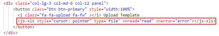 To upload an Excel file into your browser, you need to create an upload button that will handle and help us process the Excel file, within the client’s browser. To do that you just need to add and to utilize the js-xls directive as follows: