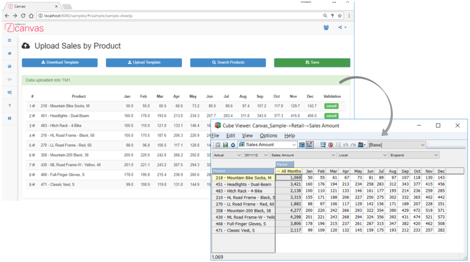 With Canvas, you can upload an Excel file into your browser, validate the data and then send the data into TM1 using the REST API. A sample showcasing has been introduced in Canvas 2.0: