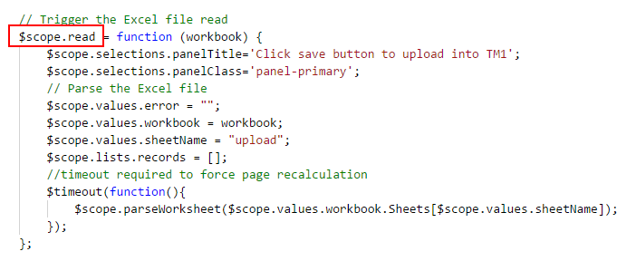 You then need to define the read function. This function takes the processed workbook by SheetJS as an argument, initializes the variables. We will then call our parseWorksheet function which will help us extract the data from the Excel file and show it into our Canvas page: