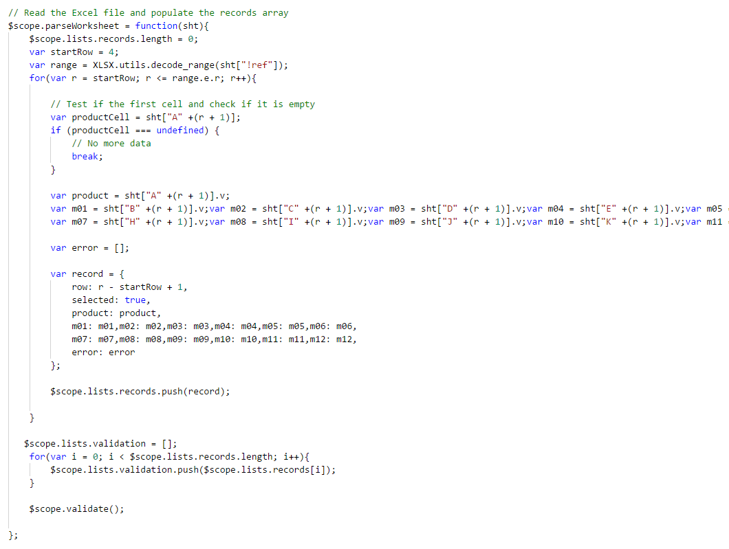 The parseWorksheet function loops through all rows and associate the cell values, to an object we will name as record: