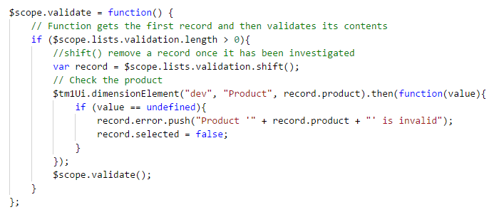 The validate function loops through all the records we have created and check if the product is in the Product dimension. If it is not, it updates the error message and set its Boolean property to indicate selection, to false (this will make the record be not selected on the front end):