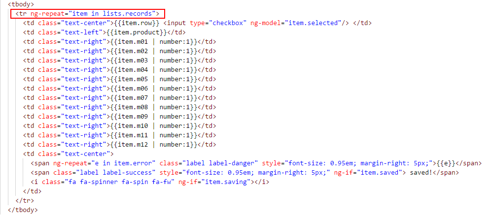 To display the records in the view, we use the ng-repeat directive in a table and iterate through the list of records we have prepared previously:
