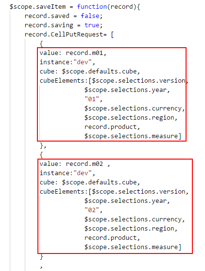Once the array is populated, we just need to use one of the available Canvas scripting service for sending data into TM1 – $tm1Ui’s service cellsetPut:
