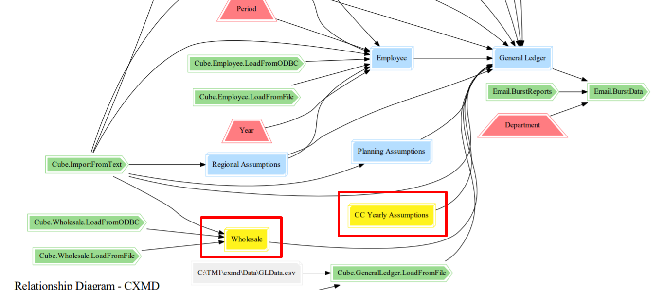 Pulse can help you to find all the cubes which have been deleted but are still in rules or processes. In the example below, the Flow Diagram shows us that the Wholesale cube is still in the General Ledger rule whereas it does not exist anymore: