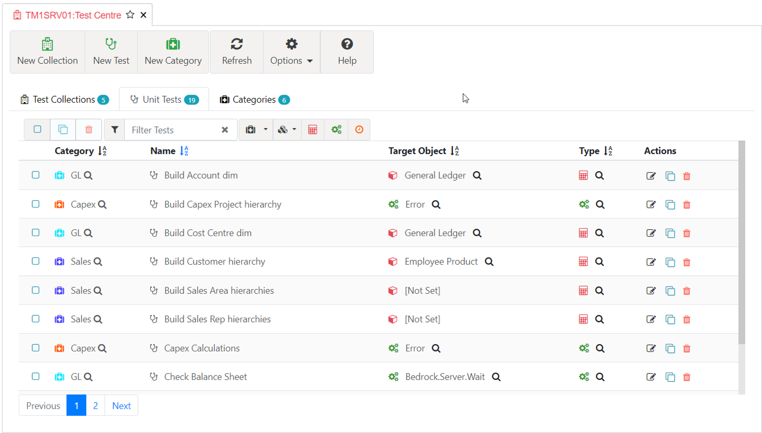 The Unit Tests tab displays the list of defined Unit Tests. To edit, click the Unit Test name, or the edit button to the right of the Unit Test. To create a new Unit Test, click the New Test