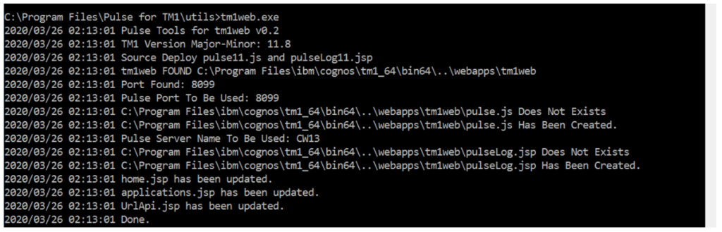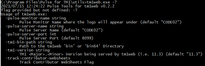 C:PAW_Misc>tm1web.exe -pulse-server-name pulseServerName -pulse-server-port 8099 -tm1-bin-path "C:Program FilesibmCognostm1webbin64" -tm1-version 11.8