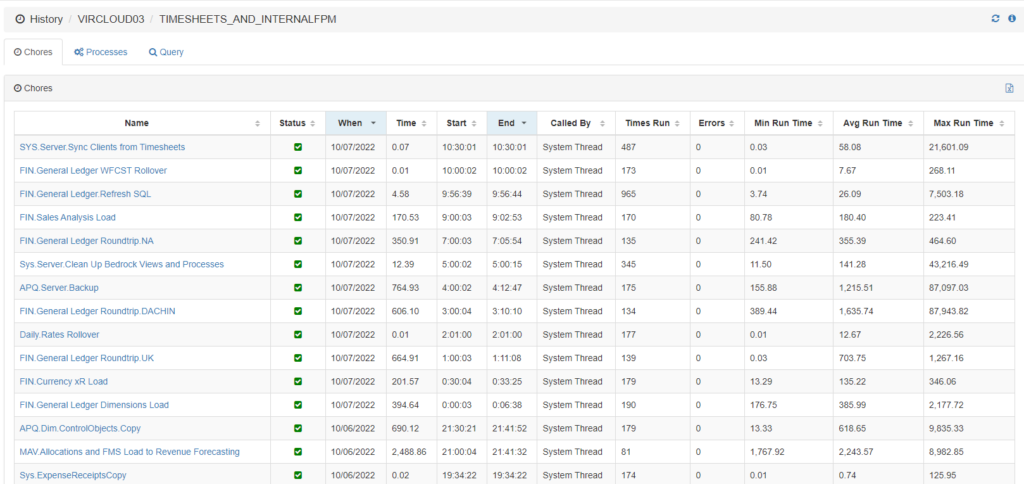This information can be seen from the Pulse Explorer. There is a dashboard called Pulse – Chore / Process history as below:
