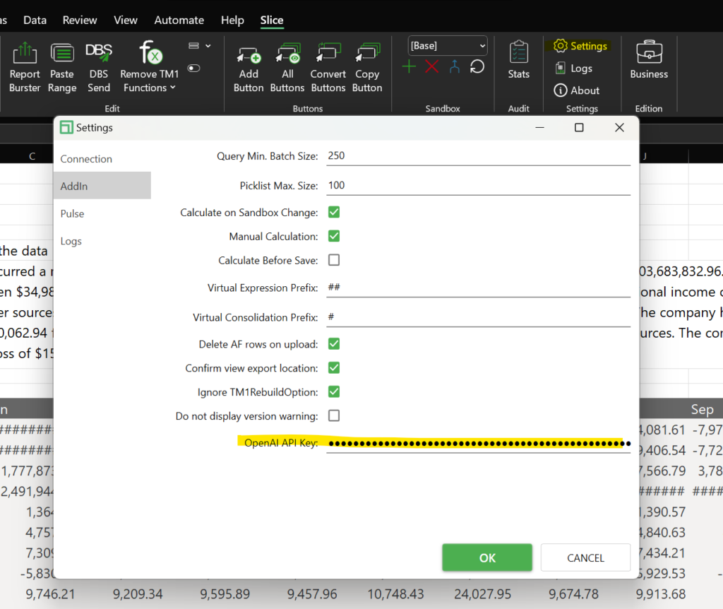 The first step is to sign-up to OpenAI and request an API key here. Once you have your key, click the Settings button in Slice, go to the AddIn tab and paste your key into the OpenAI API Key field as below: