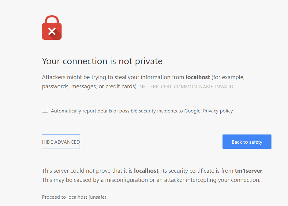 Because the SSL certificate used by TM1 is for tm1server rather than localhost you will receive an error about your connection not being private (example of Chrome below). It is safe to ignore the error (in development only) so click on ADVANCED and then Process to localhost (unsafe).