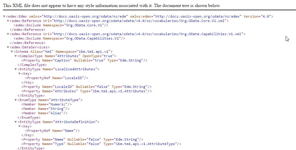You will now see the content below, which is the TM1 REST API $metadata page that describes all of the objects / actions you can take against the REST API.